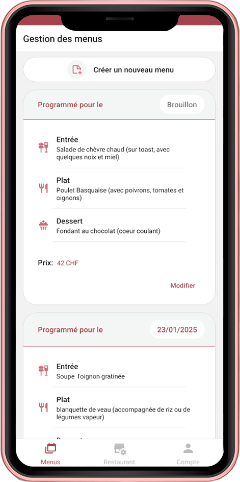 Ajoutez ou éditez votre menu du jour en quelques secondes.